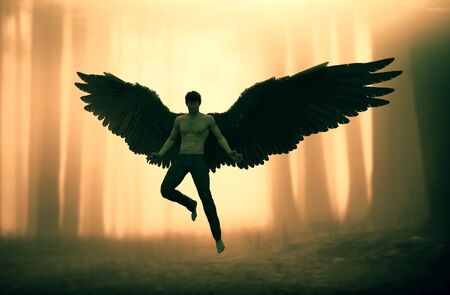 A man is standing on a rock with a winged angel above him. The angel is surrounded by smoke and fire, creating a sense of danger and mystery