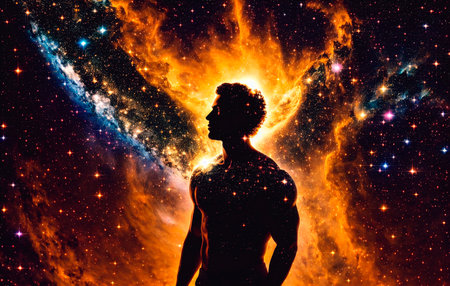 Man silhouette in space with stars and nebula. The concept of God in the image of a man against the background of the universe. Generative AI.