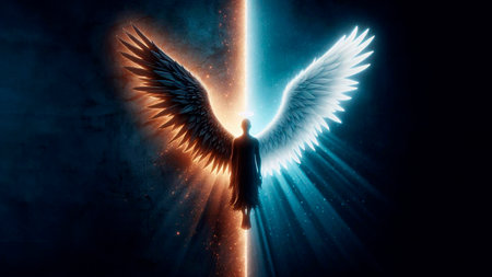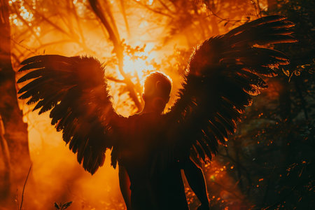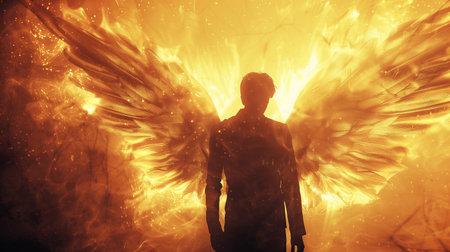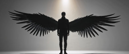 AI Generated. Silhouette of a Man with Dark Wings in a Dramatic Studio Setting