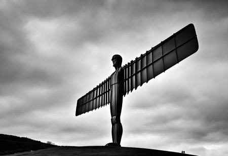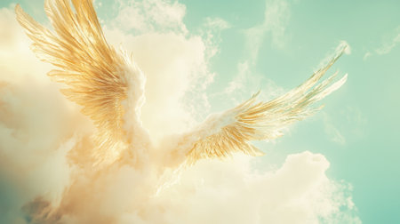 Golden Angel Wings Spread Against a Cloudy Sky Creating a Serene and Ethereal Atmosphere.