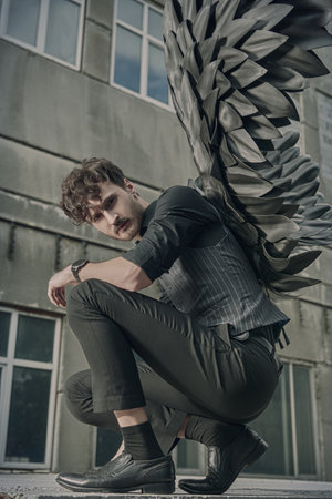 A male Black Angel sits in front of an old concrete building. The concept of war, doomsday, Apocalypse.