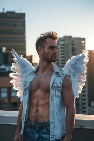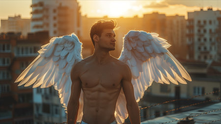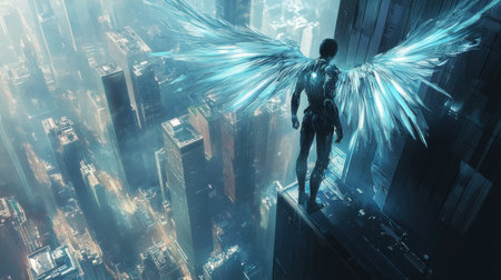 A futuristic figure with large, luminous wings stands confidently on the edge of a skyscraper, gazing over a radiant city filled with shimmering lights during twilight.