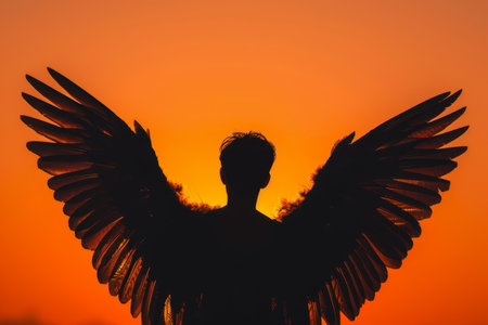 A woman is depicted as an angel with wings, standing in front of a large orange sun. Concept of peace and serenity, as the woman is at rest and the sun is setting in the background