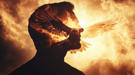 A striking silhouette of a man stands against a dramatic fiery sky, while an eagle soars from within the outline, emphasizing a powerful connection to nature at dusk.