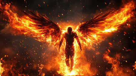 A man's silhouette stands against a bold orange background. A phoenix bursts forth from the man's head, symbolizing transformation and rebirth, as the sun sets, creating a dynamic contrast.