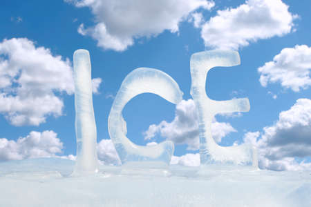 Word ICE made with real ice letters on ice.
