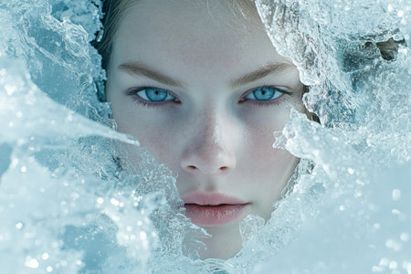 Woman with blue eyes gazes through shattered window, intense stare.