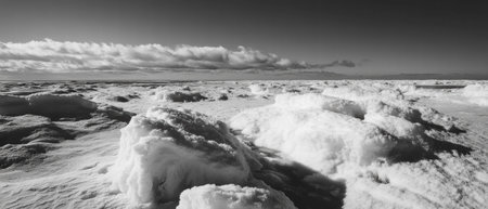Frozen lake with intricate ice formations in a serene winter landscape