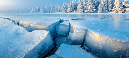 A frozen lake shows distinct cracks in the ice, revealing water beneath. The winter atmosphere is calm, with soft hues reflecting on the ice surface, highlighting the stark beauty of the season.