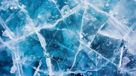 Amazing view of a frozen lake with partially thawed ice, showcasing intricate textures and captivating contrasts in shades of blue and white.