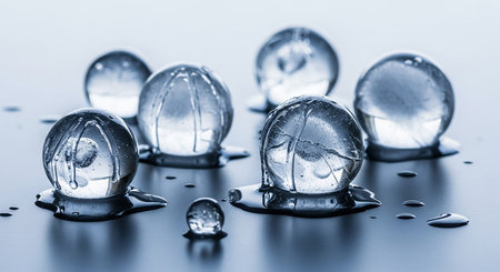 Several melting ice spheres with water droplets scattered on a dark, reflective surface.