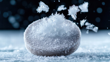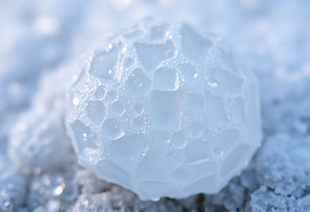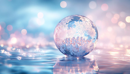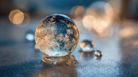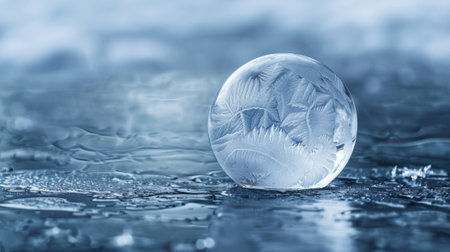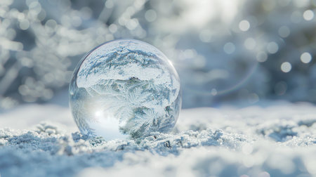 A captivating frozen orb showcases delicate snowflake patterns, reflecting soft light on a frosty surface, creating a tranquil winter atmosphere.