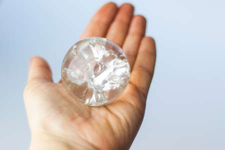 Close up macro view of hand holding crystal ball with inverted image of winter natural landscape. Sweden.