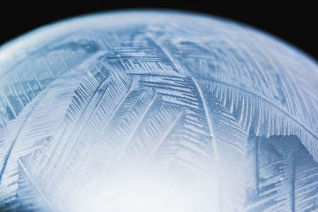 Christmas and New Year Holidays precious backdrop. Frozen snow globe christmas magic ball with flying snowflakes. Winter Background with copy space close-up. Macro shot of ice patterns frosted on ball of soap against black abstract bokeh background.