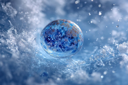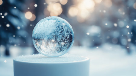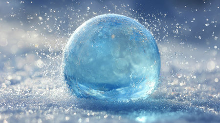 A stunning ice sphere rests on a frosty surface, surrounded by twinkling snowflakes and illuminated by a soft blue light, evoking tranquility and elegance.