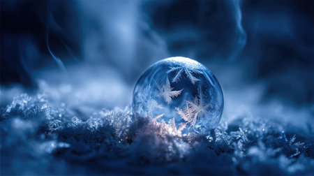 A captivating close-up of a frosted bubble resting on a bed of snow, surrounded by delicate ice crystals and an enchanting blue mist.