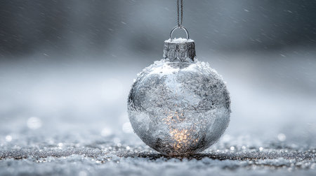 A stunning close-up image of a shimmering silver ornament nestled in the snow, capturing the essence of winter holidays with its soft light and sparkling details.