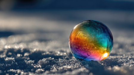 A colorful soap bubble rests on a snowy surface, reflecting light and creating stunning patterns in a serene winter landscape, capturing the essence of beauty.