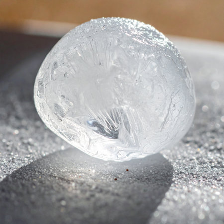 A single, perfectly imperfect sphere of ice rests on a rough surface, its crystalline interior catching the bright sunlight.
