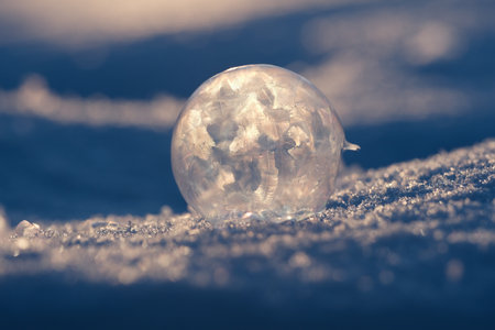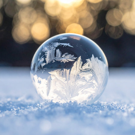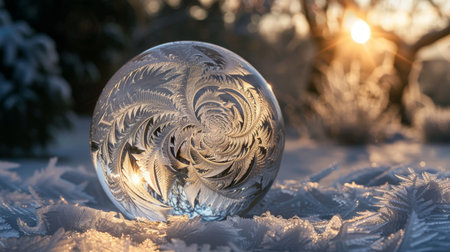 A delicate soap bubble captures the fleeting magic of a winter morning. Intricate ice crystals bloom across its fragile surface, glistening in the warm, golden light of the rising sun.