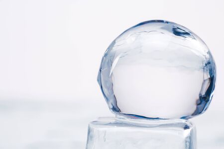 A crystal ball on the ice is reflecting the blue sky and icy surface