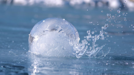 A stunning closeup of a crystal clear bubble resting on a snowy surface, surrounded by sparkling water droplets, capturing the essence of winter beauty.
