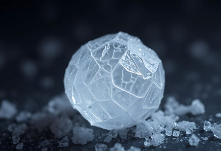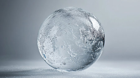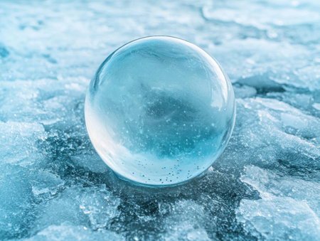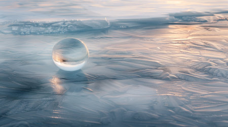 This stunning image features a clear ice sphere resting atop a frost-covered surface, surrounded by sparkling ice crystals, evoking a serene and tranquil winter scene.
