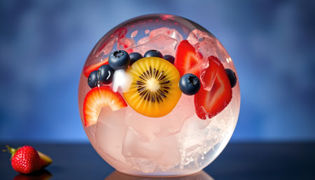 A stunning close-up of a crystal clear ice sphere resting on bed of ice cubes, perfect for enhancing cocktails and refreshing beverages, showcasing summer vibes.