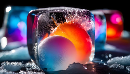 A detailed close-up of bubbles trapped in a frozen ice cube, illuminated by colorful lighting, creating a vibrant, abstract effect.