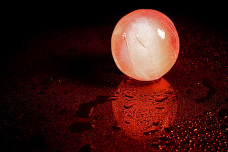 Fortune telling. Love, money, luck, success. Macro shot of transparent crystal ball with orange ornaments on glass pad with sun reflections in it.