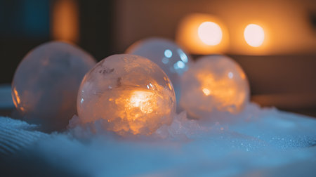 Elegantly designed ice spheres glowing with candlelight create a serene and tranquil atmosphere for relaxation.