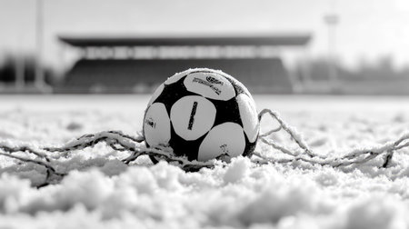 A captivating black and white photograph featuring a soccer ball resting on the snow-covered ground, with an empty stadium visible in the background. The image evokes a sense of tranquility and isolation in the sports world.