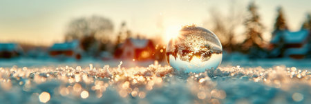 A crystal ball sits centered on a snow-covered surface, reflecting a sunset. The image highlights the ball's transparency and the surrounding texture of the snow. Warm light from the setting sun illuminates the scene, suggesting a cold, outdoor environment. Suitable for various editorial and commercial applications.