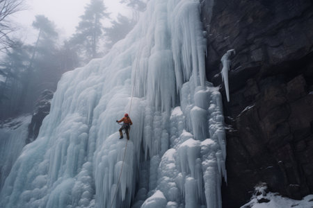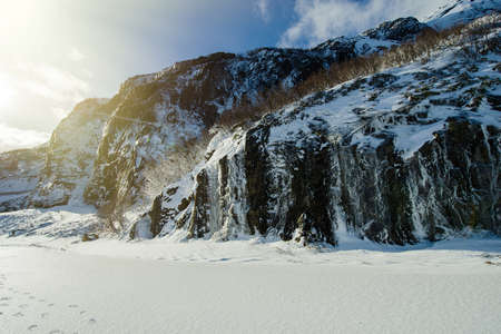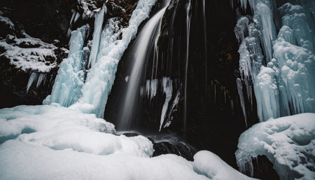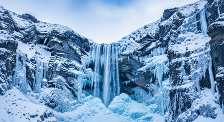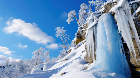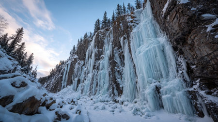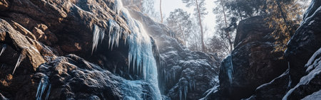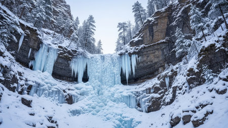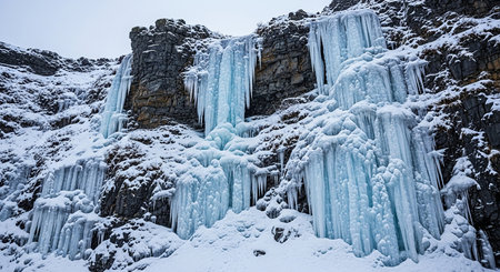 A stunning frozen waterfall cascades down a rocky cliff face in this winter scene. The image showcases icy formations, snow-covered rocks, and evergreen trees under a pale sky. The composition features a natural outdoor environment, suitable for various editorial and commercial applications. The scene evokes a sense of tranquility and the beauty of nature.