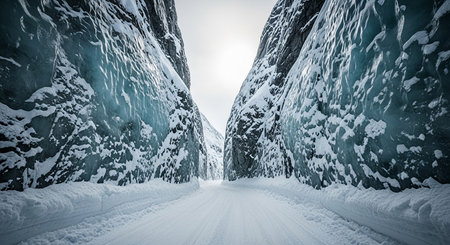 A snow covered road winds between steep, icy mountain walls under a bright sky. Clear details and vibrant colo...