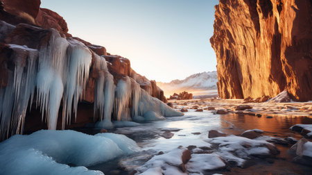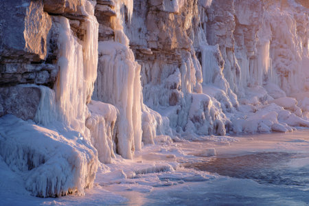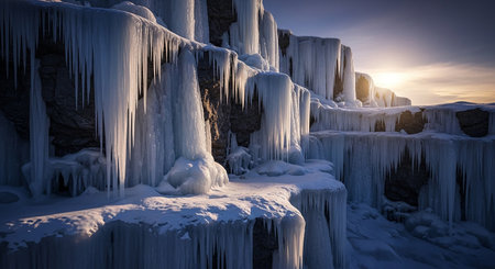 Majestic ice formations and icicles on a rocky cliff face illuminated by sunset light