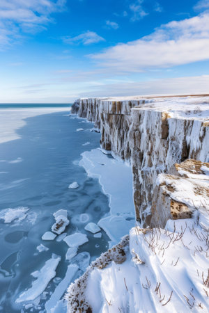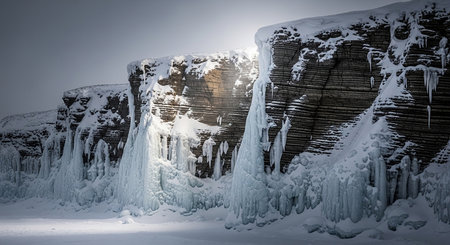 Frozen in Time Dramatic Coastal Cliffs Tower Over Icy Nordic Seascape, Natural Colors