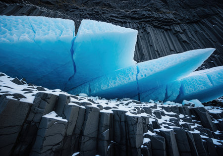 Massive, fractured blocks of vibrant blue glacial ice contrast sharply with the dark, hexagonal basalt columns below, creating a dramatic winter landscape.