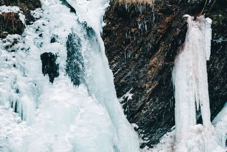 Frozen waterfall in winter, close-up. Beautiful winter landscape.