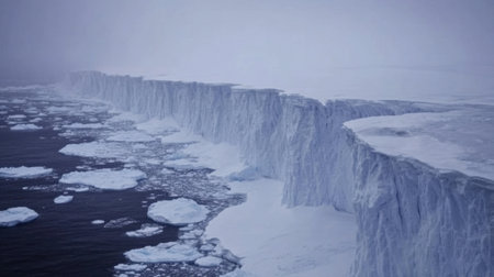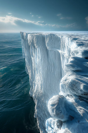 A breathtaking view of a massive ice cliff towering over the calm ocean, showcasing the beauty of winter landscapes and serene natural wonders.
