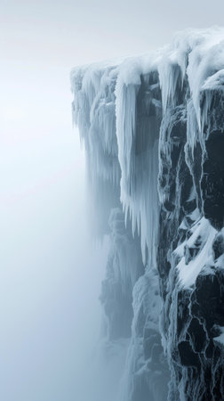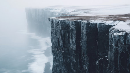 Frozen in Time Dramatic Coastal Cliffs Adorned with Snow and Ice Overlooking Foggy Nordic Sea