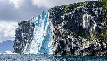 A colossal wall of ancient blue ice, a tidewater glacier, stands in stark contrast to the dark, rugged cliffs of a remote coastline.