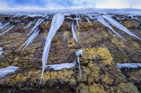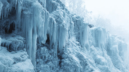 Icy cliff with hanging icicles in foggy weather, winter landscape. Cold and serene nature concept