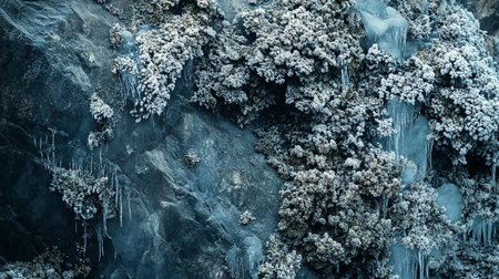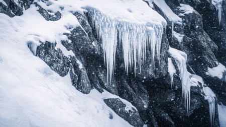Captivating scene of icicles elegantly suspended from snow-covered rocks, highlighting the tranquil beauty of winter and the serene atmosphere of falling snow in nature.