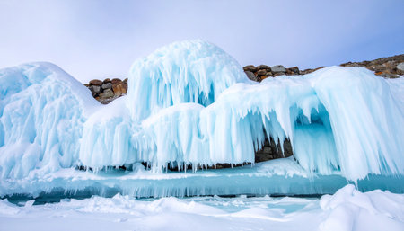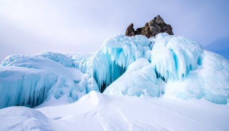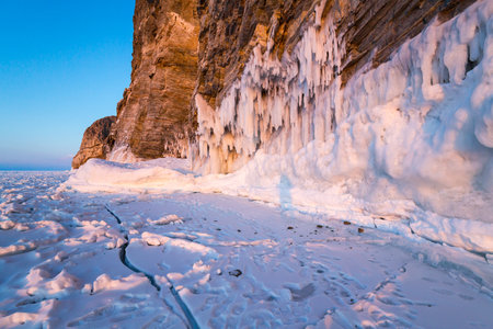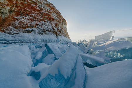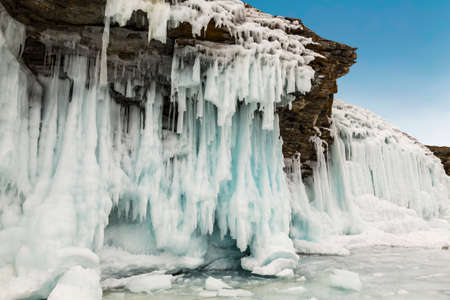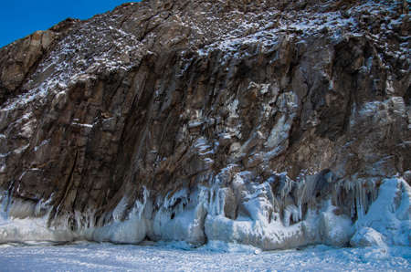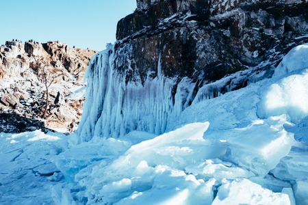 View of the icy rocks off the shore of Olkhon Island on Lake Baikal on a sunny winter day. Western Siberia, Russia