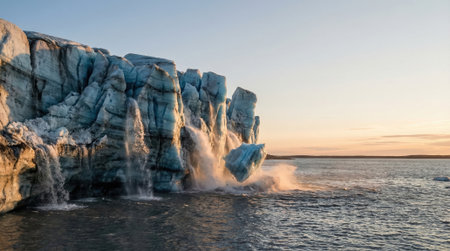Dramatic glacier calving into ocean with large ice chunk and waterfalls.