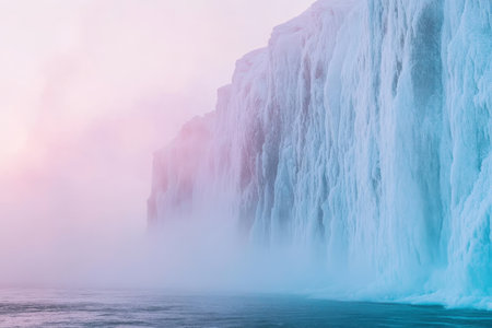 A striking ice cliff juts out over still waters. The cliff's rugged texture and smooth surface contrast beautifully with the serene backdrop creating a captivating natural wonder.
