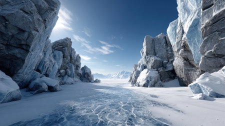 A vast expansion of ice and snow stretches between towering, jagged cliffs. The clear blue sky contrasts with the icy terrain, creating a serene winter setting.