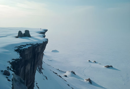 A high vantage point overlooking a vast, snowy plain, with jagged rocks protruding from the pristine snow at the cliff's edge.