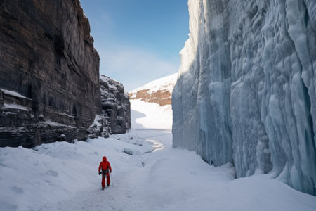 A man in red explore freezing wild snow covered mountain cliff. Winter seasonal concept. AI generated.